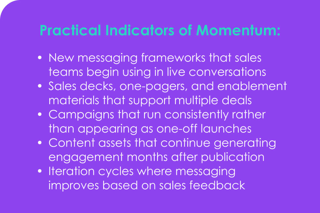 Strong performance shows up in how the business operates. Campaigns move quickly, teams align around a clear narrative, and sales conversations become more effective. These signals often provide a more accurate view of impact than isolated metrics.